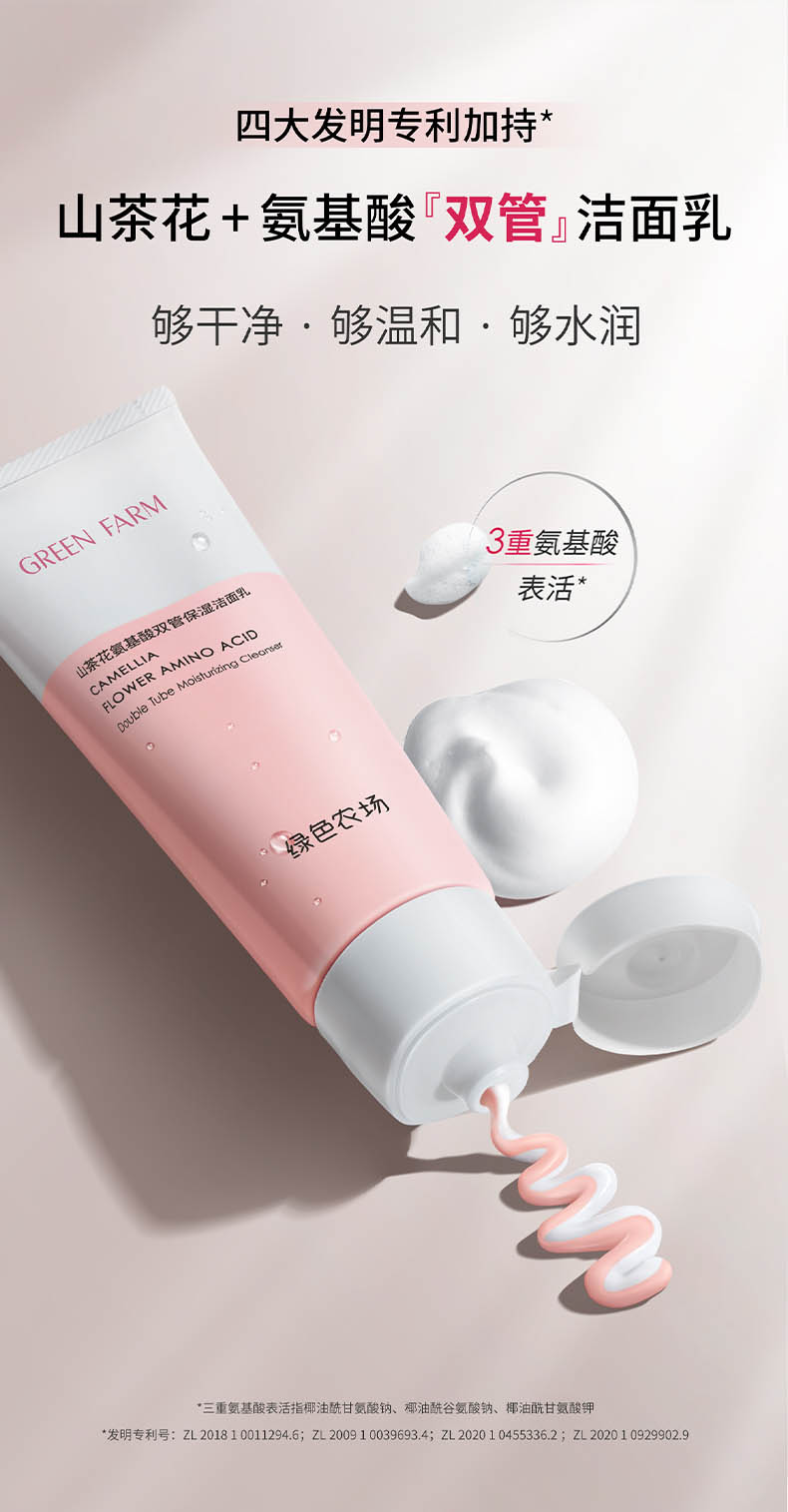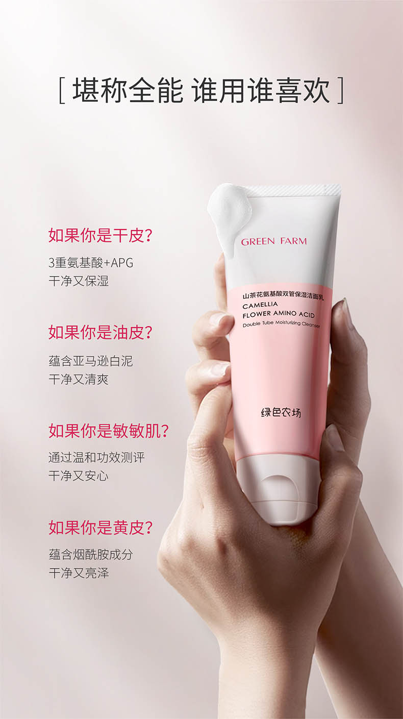 描述:独特双管洁面设计,蕴含山茶花精华以及氨基酸表活成分。温和洁净肌肤,丰润乳霜质地,