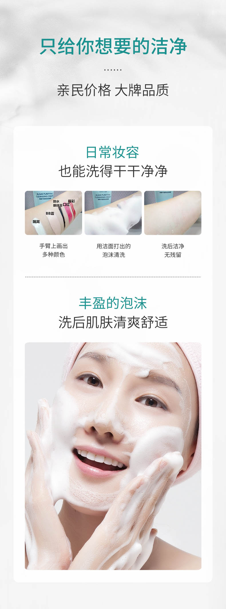 描述:产品配方亲肤、泡沫细腻,蕴含海藻精华成分,能清洁肌肤表皮及毛孔污垢、彩妆残留物,并调理水油平衡,给予您清爽的洁面体验,令肌肤洁净不紧绷。