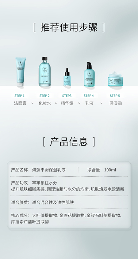 描述:含海藻精华及多种植物成分,质地清滢柔滑,帮助肌肤牢牢锁住水分,同时提升肌肤细腻质感,并调理油脂与水分的均衡,让您的肌肤水盈清新不易油腻。